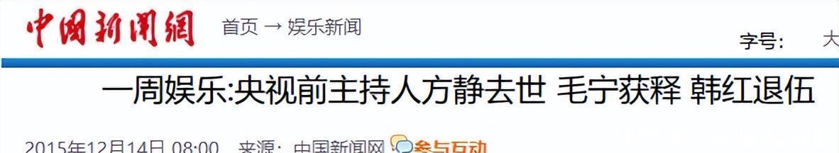 中国新闻网 ——一周娱乐:央视前主持人方静去世 毛宁获释 韩红退伍
