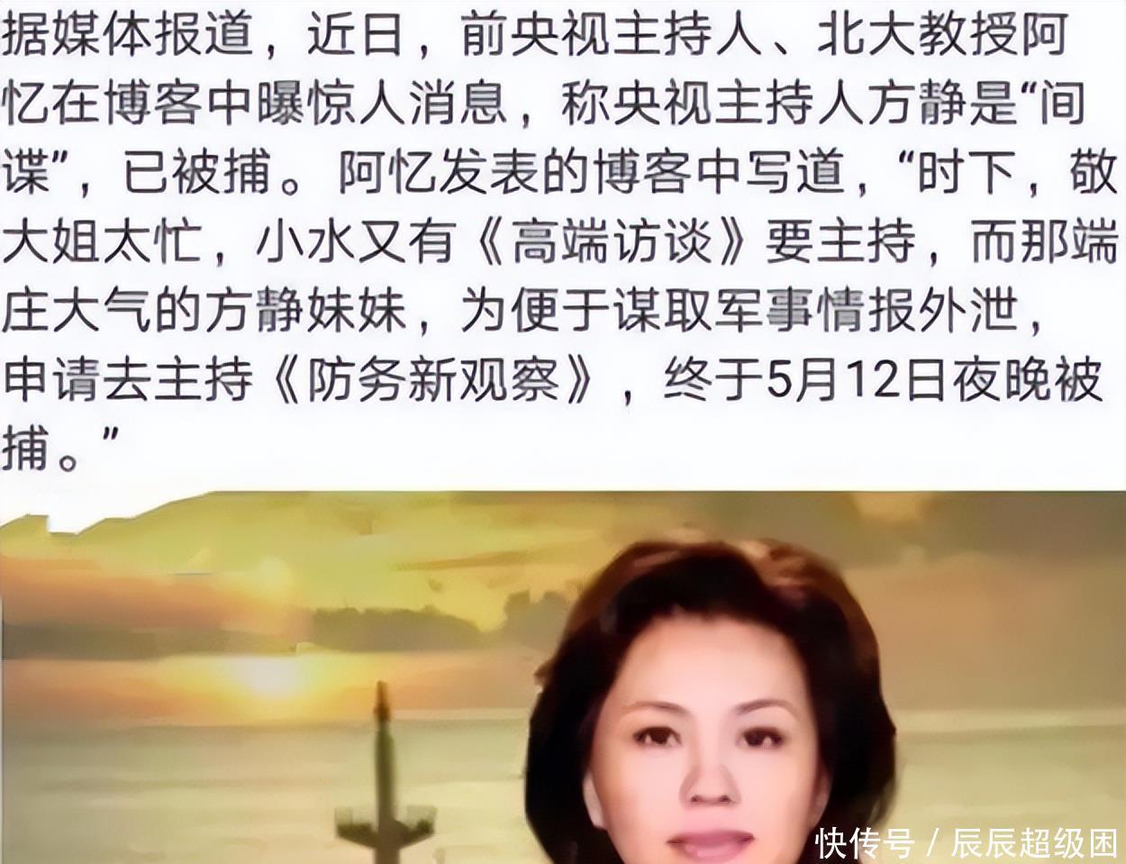 2009月,一位北大副教授、曾代班过《焦点访谈》主持人的阿忆。突然在网上爆料,央视著名主持人方静是间谍,已日被捕。在他的口中,在美国呆过的方静早已被策反。所以回国的她,为了谋取军事情报,才在后来申请去主持《防务新观察》。